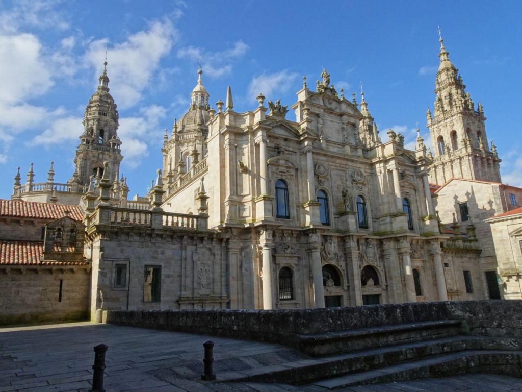 Un beau soleil ainsi qu’un vent très fort nous accompagnaient pour cette dernière étape du chemin portugais. Après quelques kilomètres parcourus les deux clochers de la cathédrale de Santiago de Compostela se profilaient dans le soleil levant.
