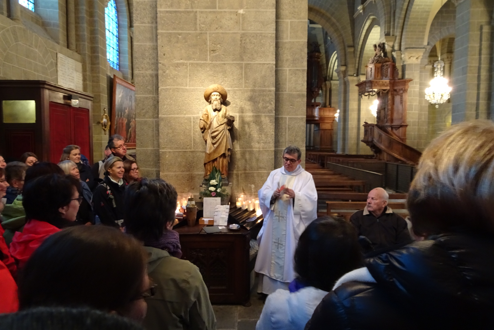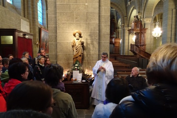 Debout à 7h00 pour aller à la messe de 7h00. Ça commence fort. Nous sommes arrivés en pleine eucharistie. Puis nous avons assisté à la bénédiction des pèlerins. C’est fait maintenant il ne peut plus rien nous arriver. Le curé bilingue et drôle a essayé de nous vendre sa sauce… C’était sympa ça nous a mis direct dans l’ambiance.