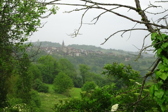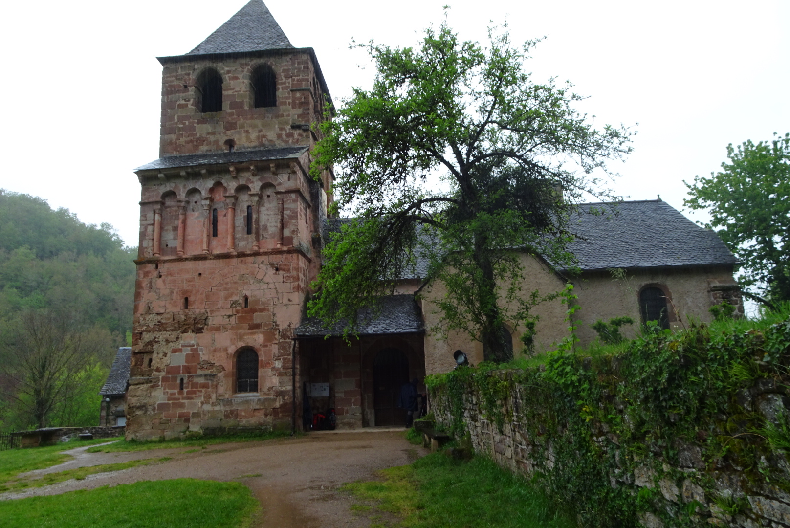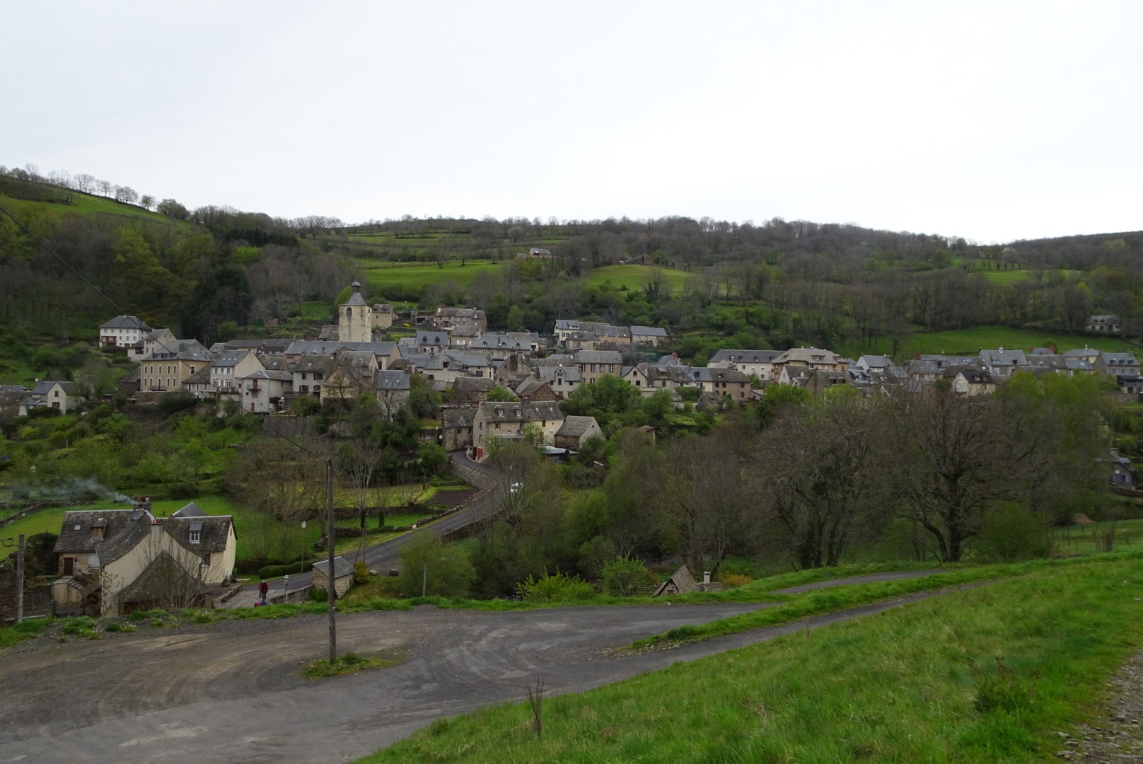C’est dans la brume et le froid que nous laissons Golinhac. Petit village bien tranquille où il ne se passe rien mais alors rien. La grosse pluie a cessé laissant la place à de sporadiques averses, nous obligeant à enfiler et retirer nos capes de pluie. Quelques heures plus tard nous sommes en vue du village d’Espeyrac bien logé dans la verdure .
