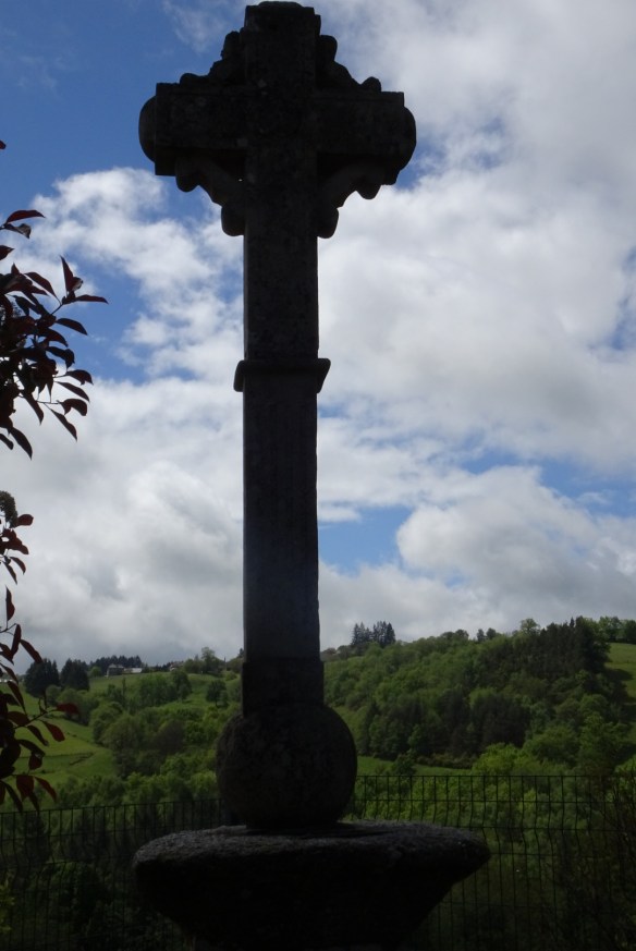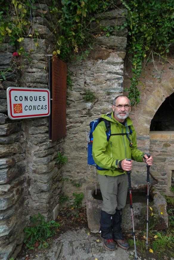 C’est dans la brume et le froid que nous laissons Golinhac. Petit village bien tranquille où il ne se passe rien mais alors rien. La grosse pluie a cessé laissant la place à de sporadiques averses, nous obligeant à enfiler et retirer nos capes de pluie. Quelques heures plus tard nous sommes en vue du village d’Espeyrac bien logé dans la verdure .