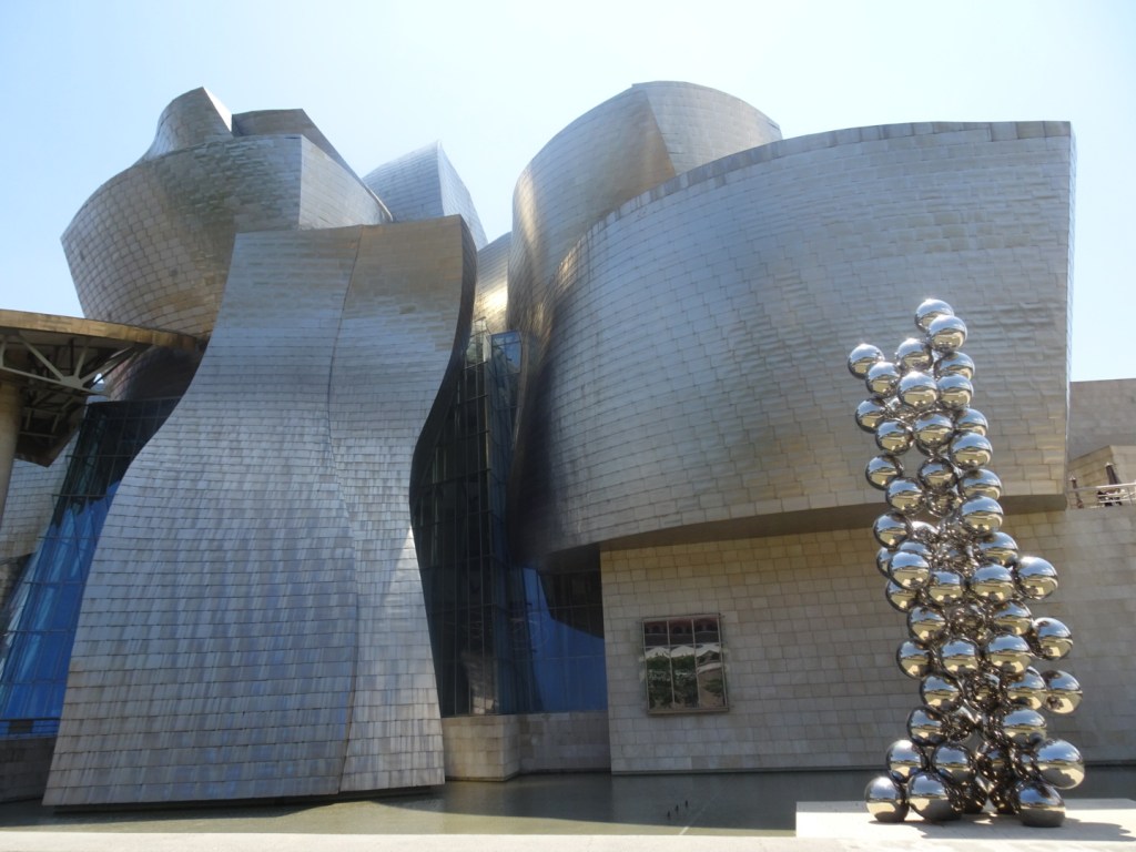 Départ à l’aube de Bilbao. Dernier regard sur le musée qui commence à briller dans les lueurs matinales.