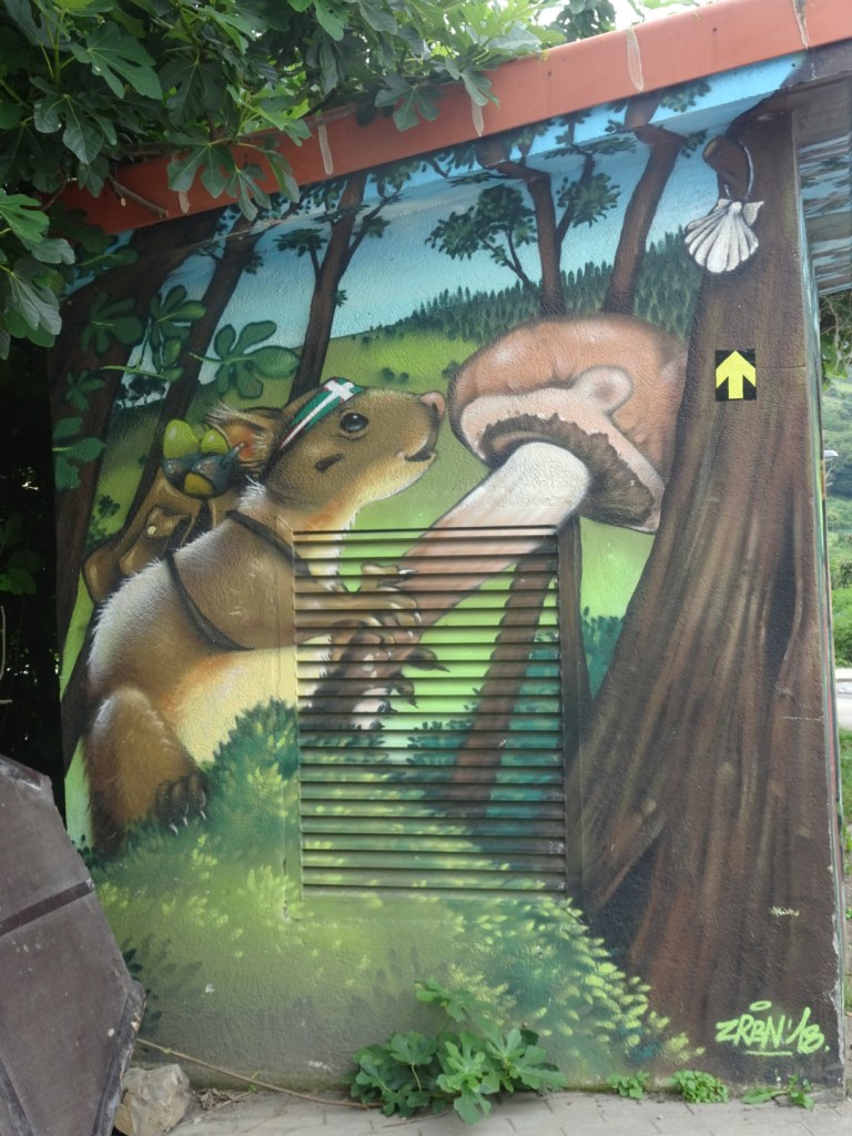 Puis le chemin se poursuit sur plus de 10 km sur une piste goudronnée que l’on partage avec les cyclistes. Rien à voir et très monotone. De temps en temps un élément attire l’attention.