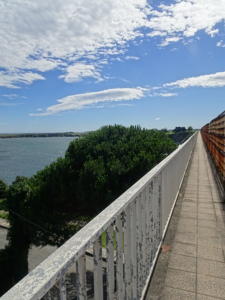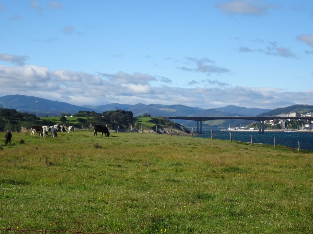 Au bout d’une heure et demie de marche on aperçoit le pont de Ribadeo. (la rive de l’Eo). Ce pont de 600m traverse la rivière Eo et fait frontière entre les Asturies et la Galice. L’autoroute passe dessus et les piétons aussi. Ce n’est pas très agréable d’autant plus qu’il y avait un vent extrêmement violent ce jour ci.