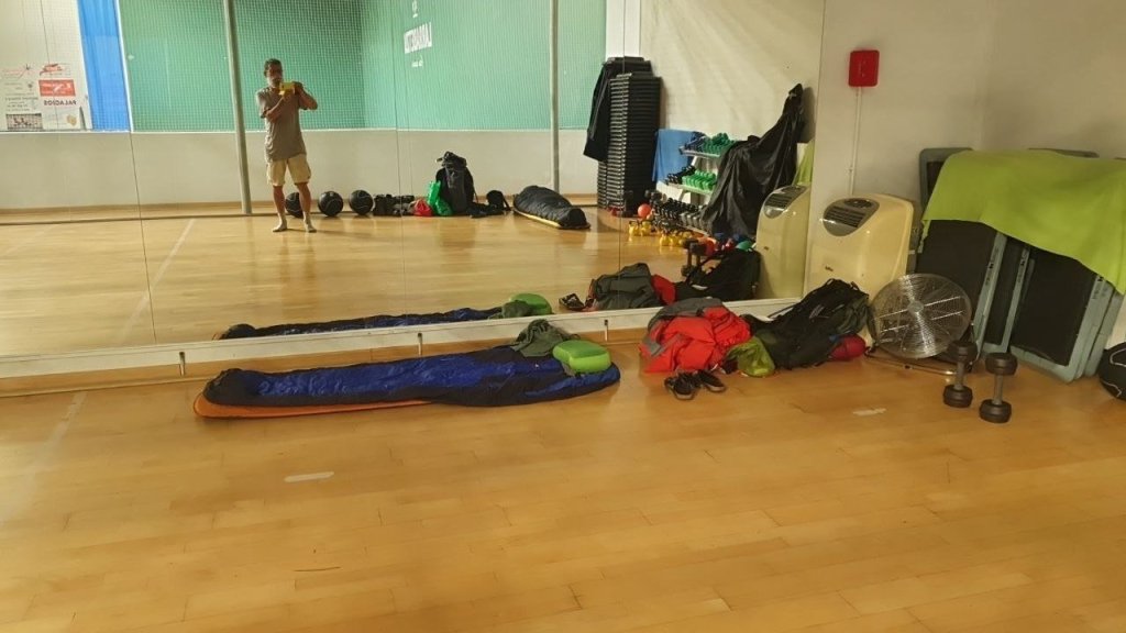 C’est bien que tu aies pu dormir dans ce gymnase au sec.