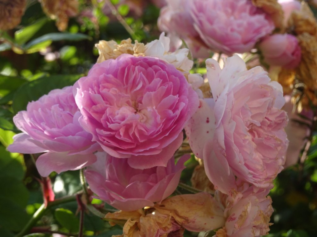 En ce qui concerne ces belles fleurs roses, ce sont sans conteste des roses, n’en déplaise à Laurent mais qui effectivement présentent un petit air de cousinade avec certaines fleurs de pivoine. Après recherches, il me semble que ce sont sans doute des roses de Damas.