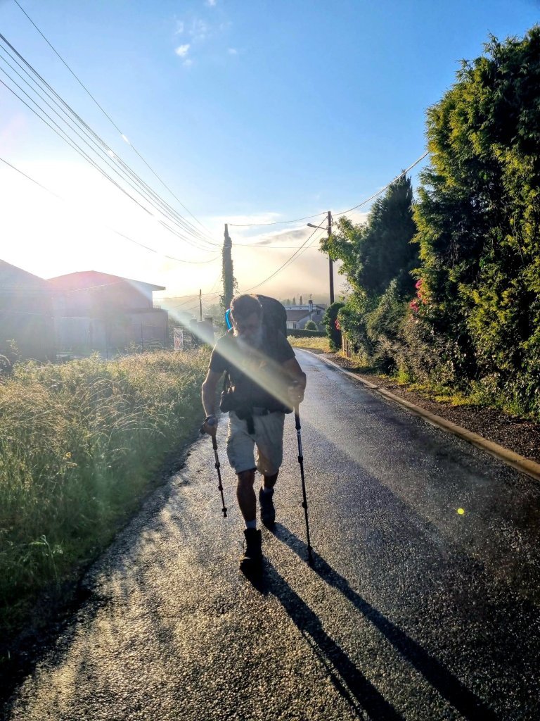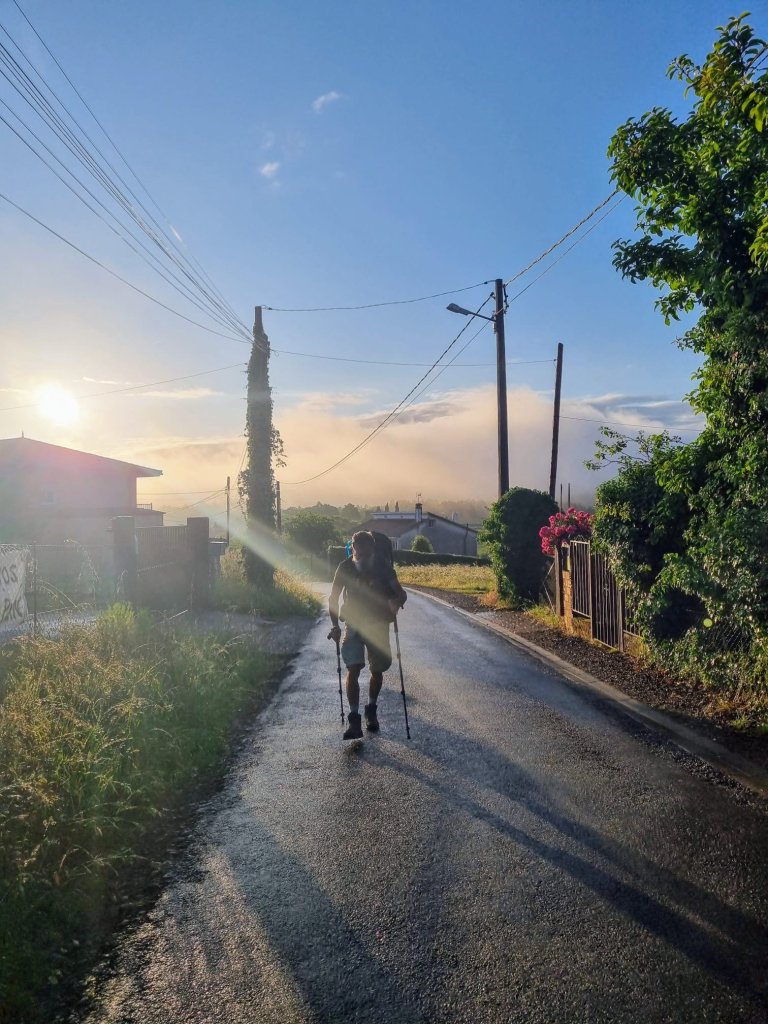 J’ai tranquillement laissé passer l’orage et je me suis rendormi. Et lorsque je me suis réveillé, c’était le désert. J’ai préparé tranquillement mon sac et je suis parti. Il faisait beau, j’y allais d’un pas tranquille et j’ai mis pour la première fois des écouteurs sur les oreilles et de la musique pour m’isoler et de pas entendre tous les jacassements des pèlerins excités.